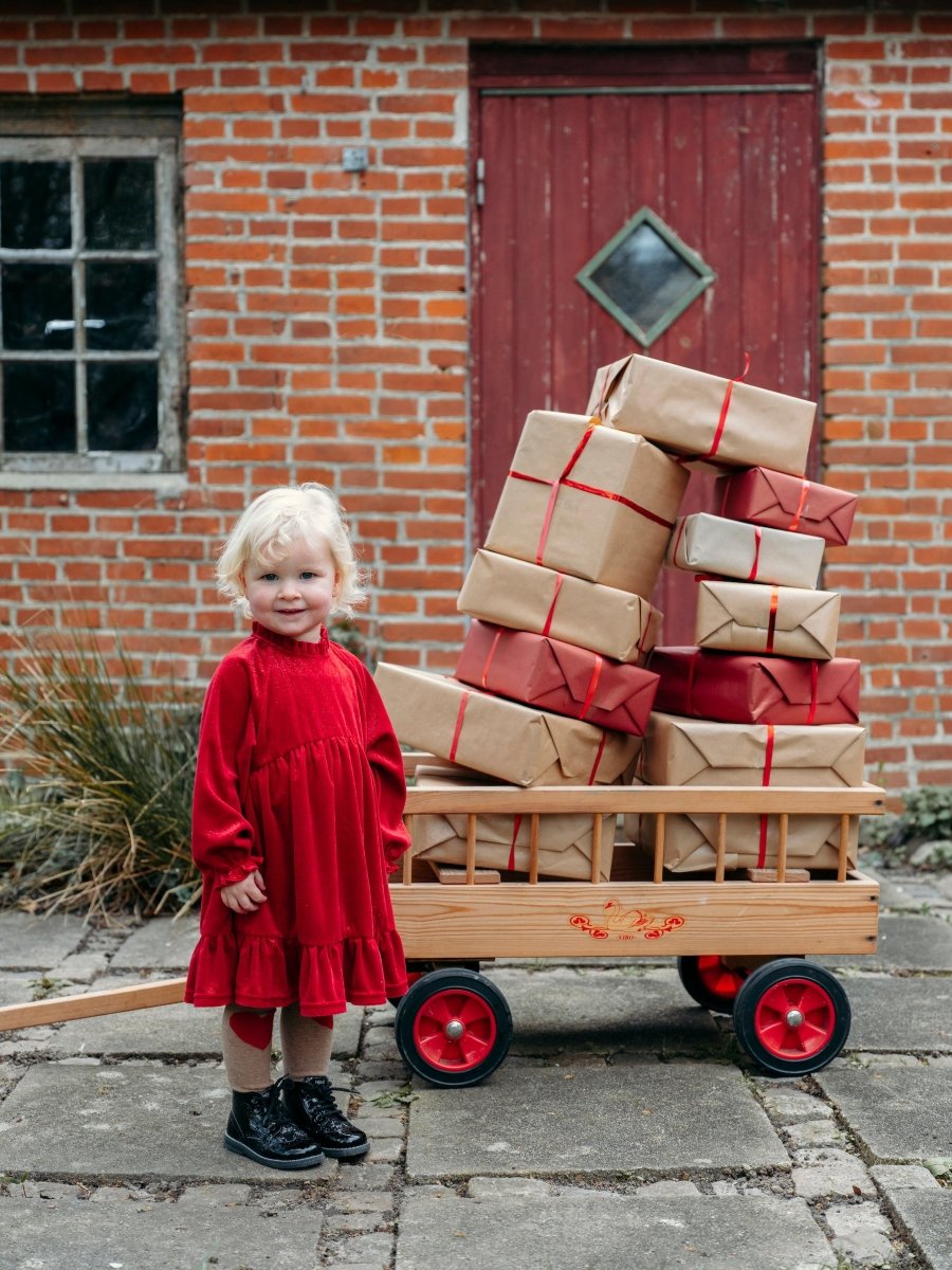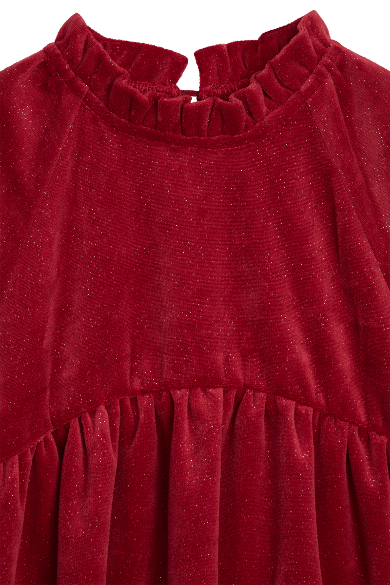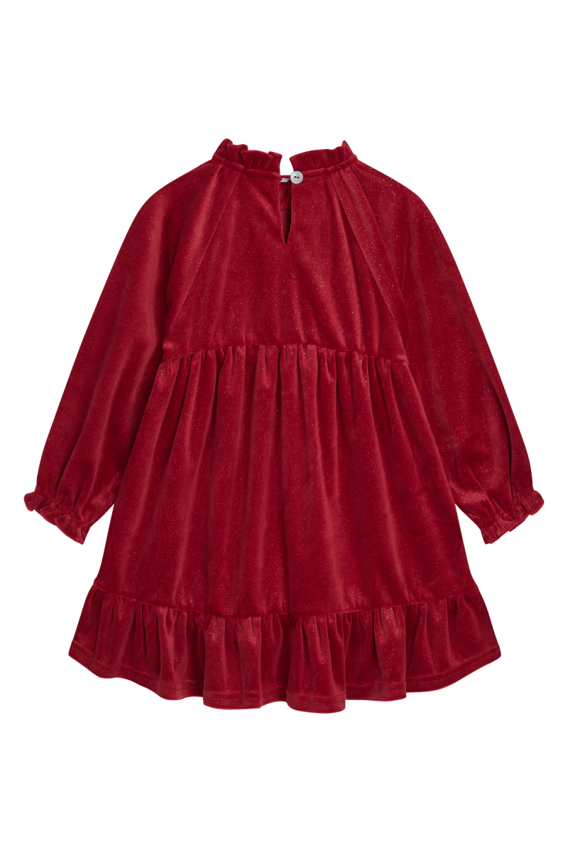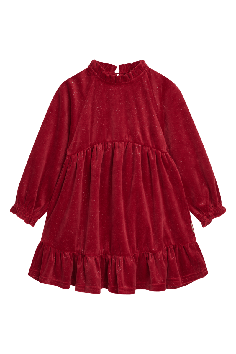 Vakker julerød kjole i myk velour med fine glitterdetaljer.