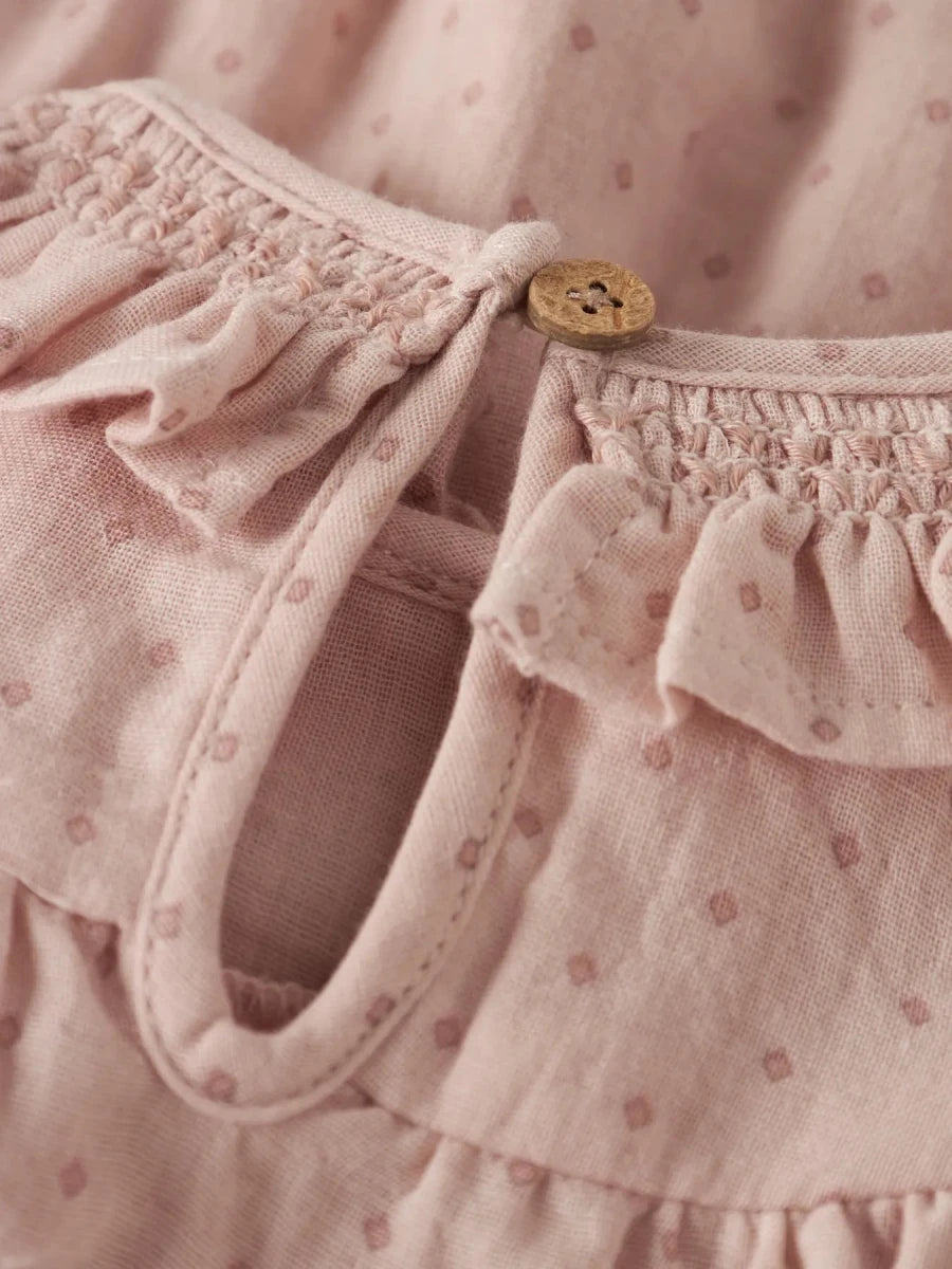 Ein nydeleg romper i mjuk, vevd bomull – perfekt for små kvardagsaugneblinkar og fine stunder. DEMBE-romperen har ein luftig, laus passform med delikate rynkedetaljar og volangar i halsen som gir eit klassisk og tidlaust uttrykk.