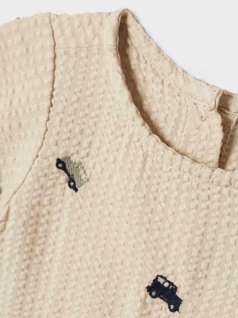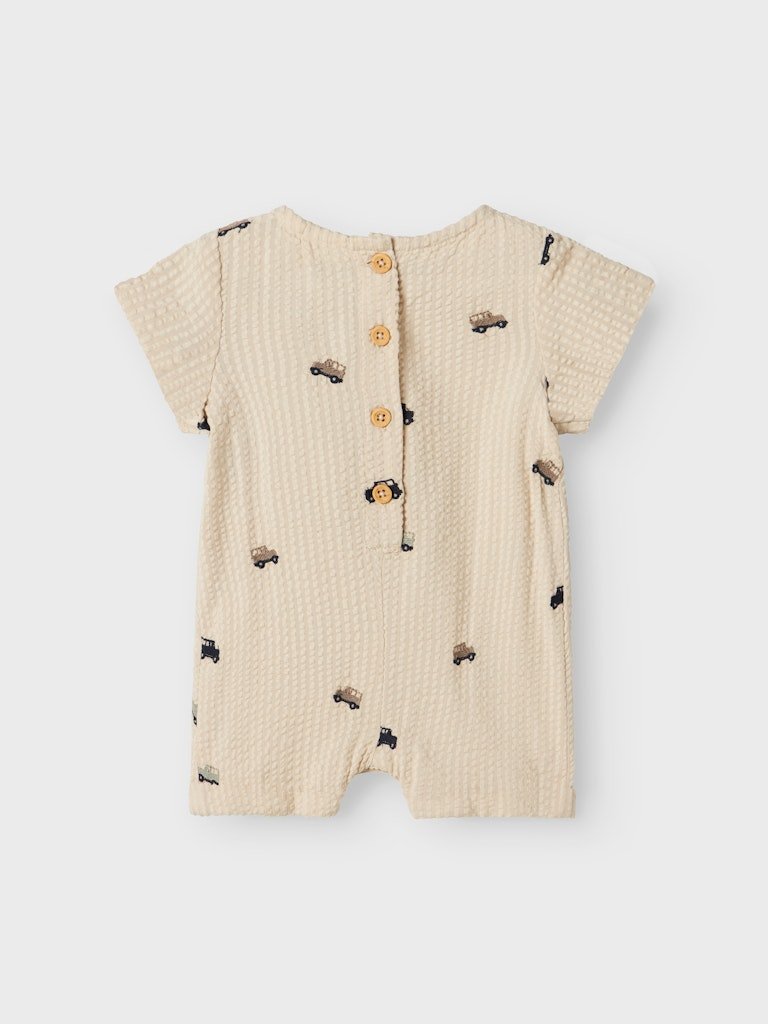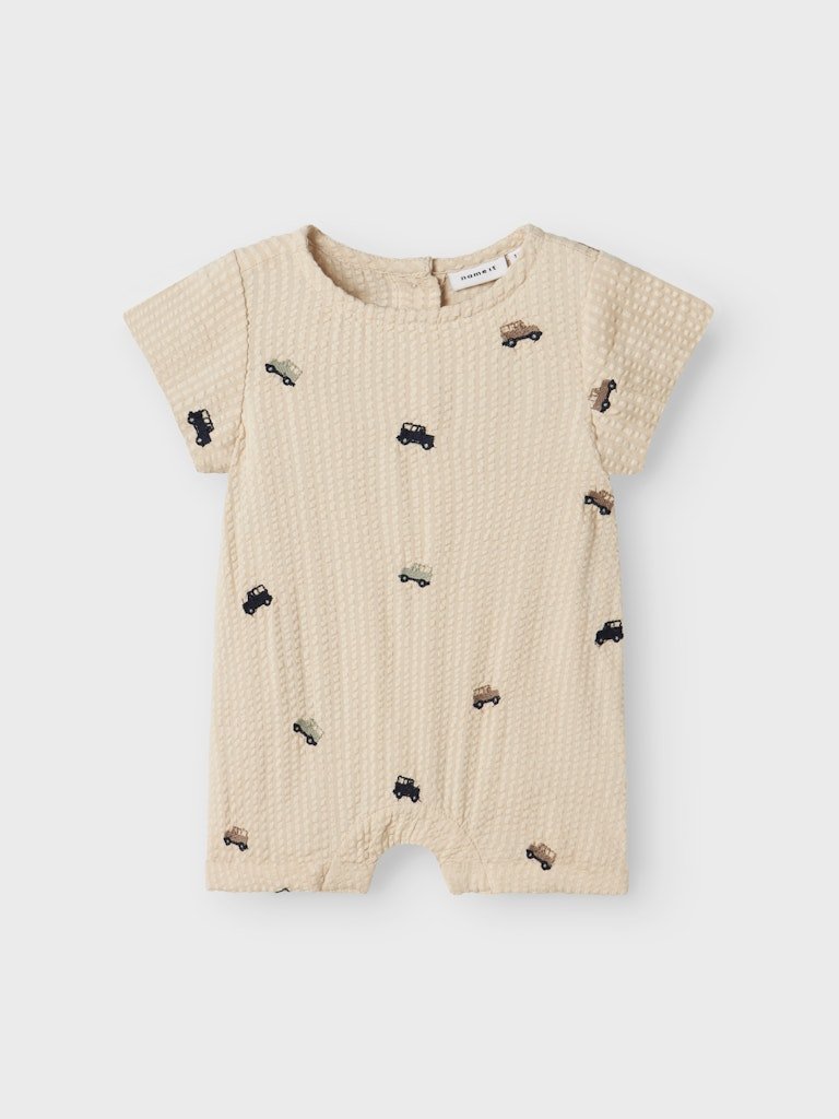 Supersøt romper i nydelig beige farge med skjønne små biler brodert på stoffet. Perfekt til sommeren eller med strømpebukser og cardigan til.