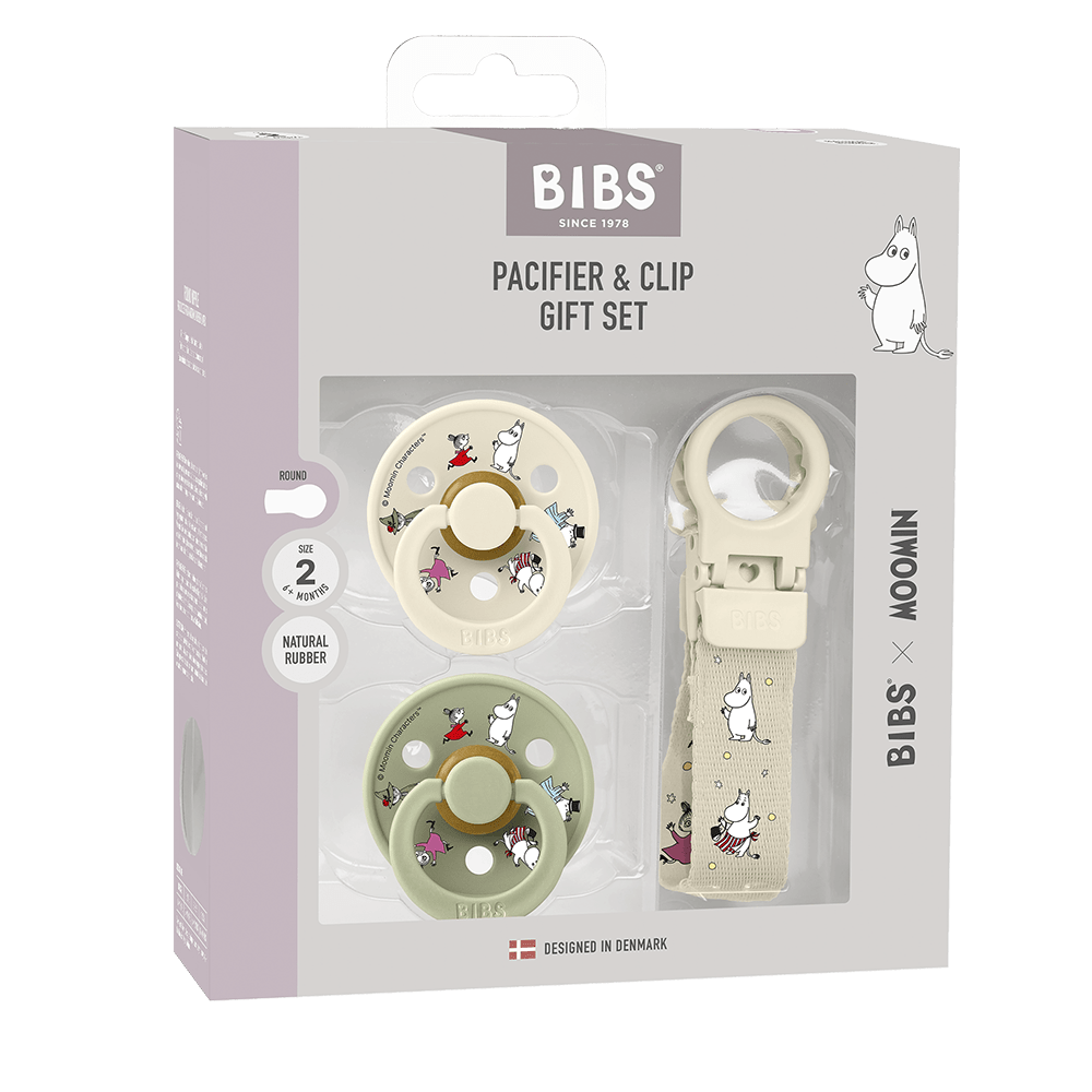 Settet inneholder to BIBS Colour-smokker i naturgummilateks (str. 2) i fargene Ivory og Sage, samt en matchende Loop smokkelenke i Ivory – alle dekorert med de ikoniske Moomin-figurene.