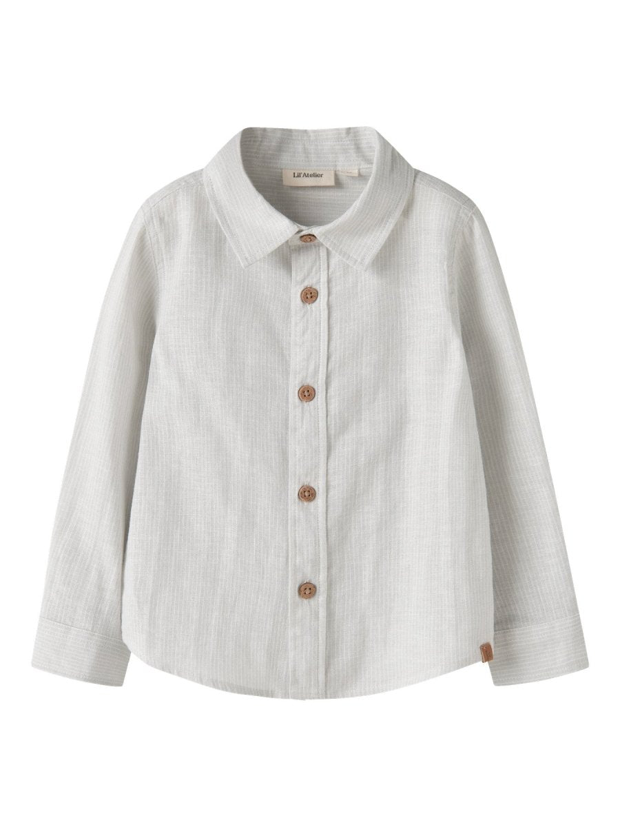 Lil’ Atelier JESPER skjorte i fargen Gray Dawn er en klassisk og behagelig skjorte til barn, laget i en myk blanding av lin og økologisk bomull.