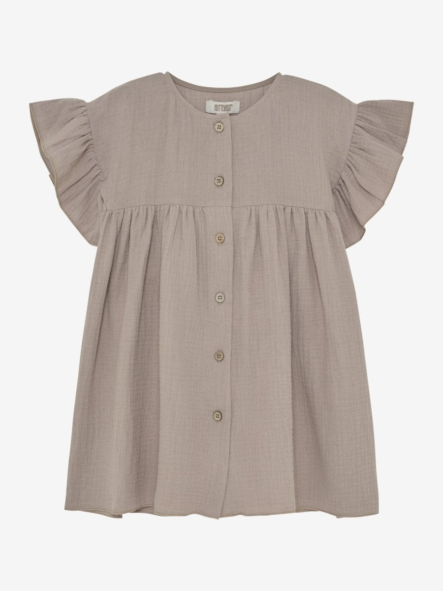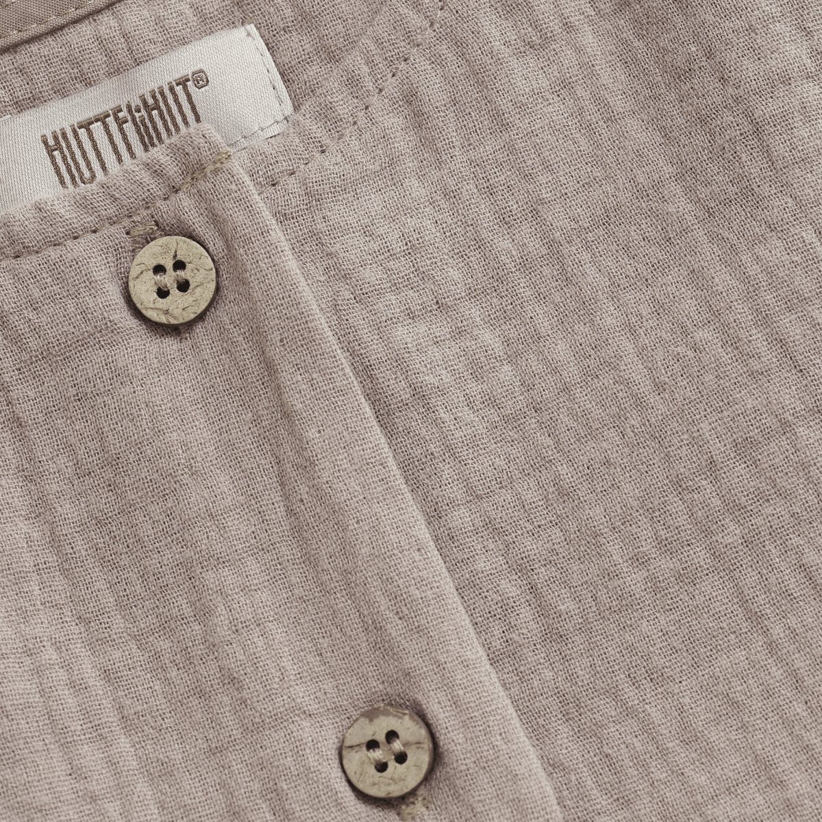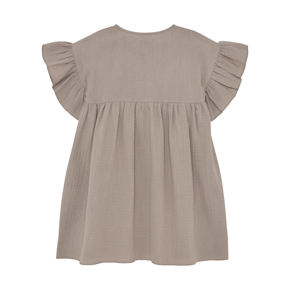 Denne nydelige musselinkjolen fra HUTTEliHUT er laget i 100 % bomull og har den myke, luftige kvaliteten vi elsker til varme dager. Fargen Moon Rock er dempet og naturlig – enkel å style og like fin til barnehage som til sommerfest.