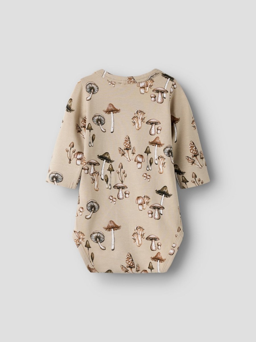 Gi minstemann en deilig start på dagen med name it baby OFEYAN LS BODY i fargen Island Fossil. Bodyen har et lekent soppeprint i delikate jordfarger, som gir en trendy og naturinspirert look – perfekt til både hverdags og kosestunder.