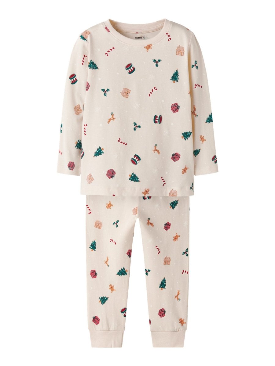 Årets julepysj fra Name it er klar til å skape ekte julestemning! Denne todelte pysjen i fargen Whitecap Gray har et festlig all-over print med juletrær, pepperkakehus, gaver, trommer, reinsdyr og sukkertøy. Perfekt for koselige desemberkvelder og julemorgen med familien.