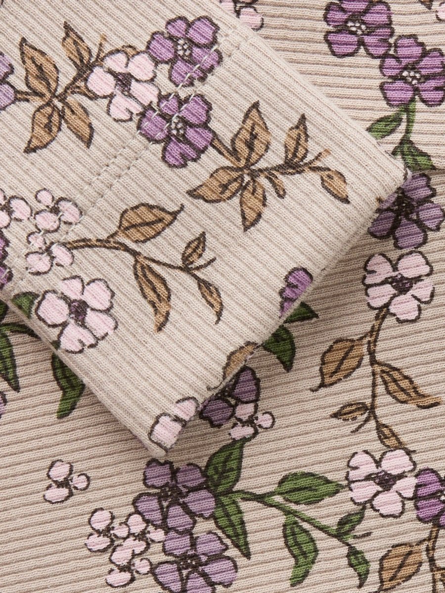 Leggingsen kommer i fargen Goat, en varm og naturlig beige tone som fremhever det fine blomsterprintet i lilla, rosa og grønne nyanser. Det romantiske mønsteret gir plagget et tidløst og sjarmerende uttrykk – perfekt til både lek, barnehage og koselige dager hjemme.