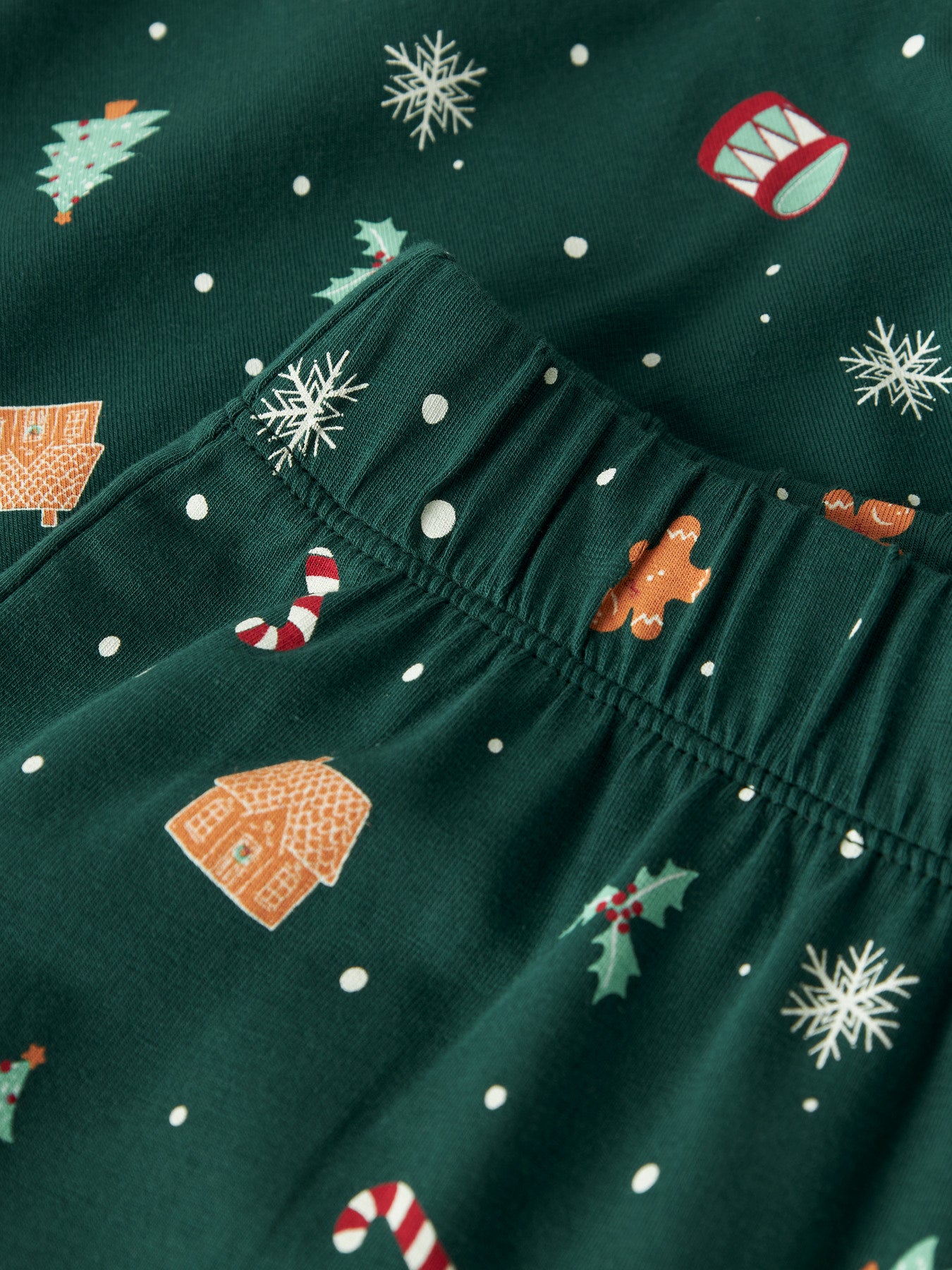 Den består av to deler, med langermet topp og matchende bukse i klassisk juleprint – like fin på barn, ungdom og voksne.