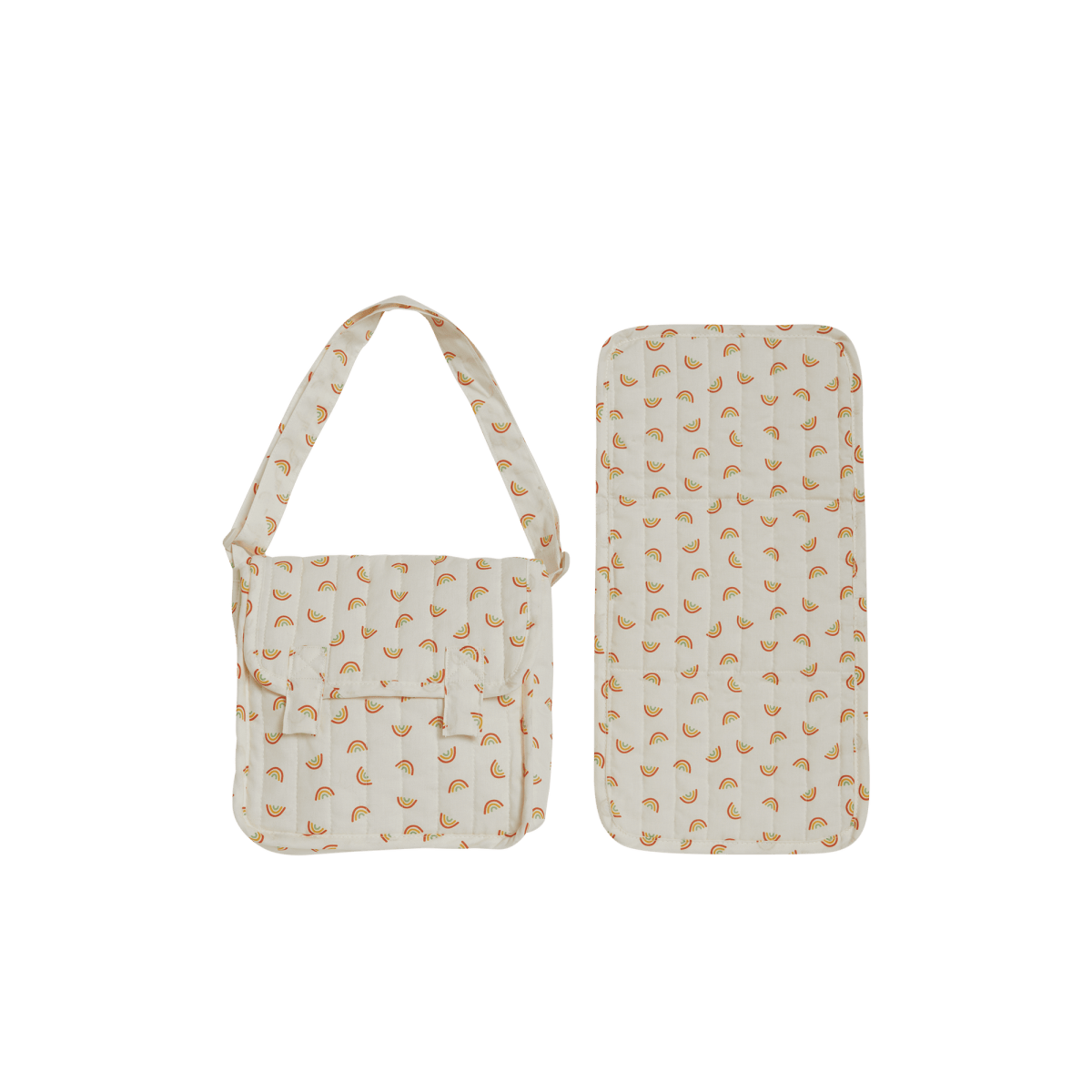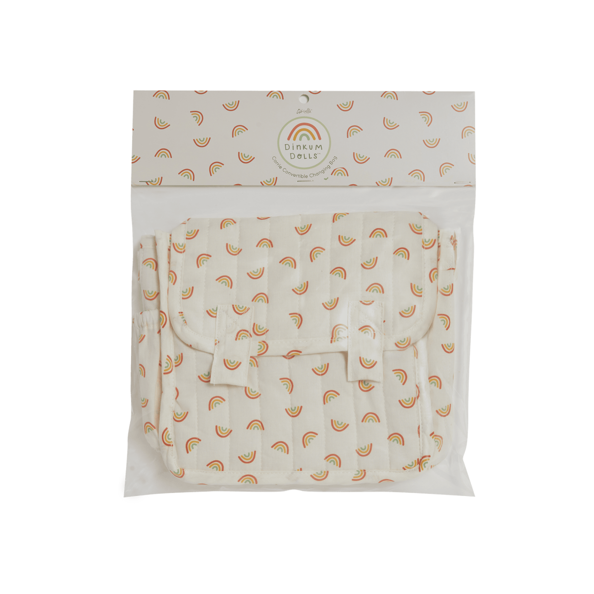 Gi små “mini parents” alt de trenger til dukkelek på farten! Carrie Convertible Changing Set i Rainbow-print er en allsidig stelleveske laget for Dinkum Dolls, bamser og andre små favoritter. Vesken kan brukes som ryggsekk, skulderveske eller crossbody, og festes enkelt på både Olli Ella Strolley og Sollie Stroller – perfekt for små som elsker å ta med dukkene sine overalt.