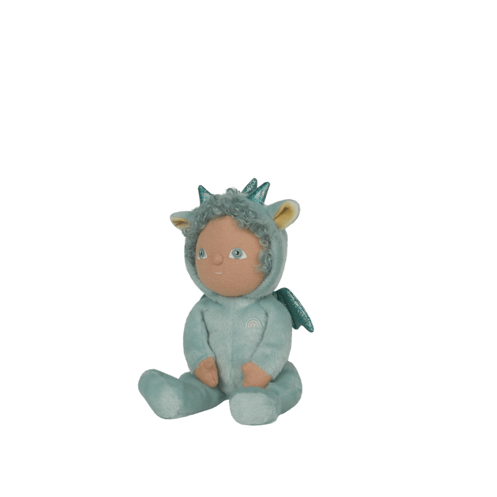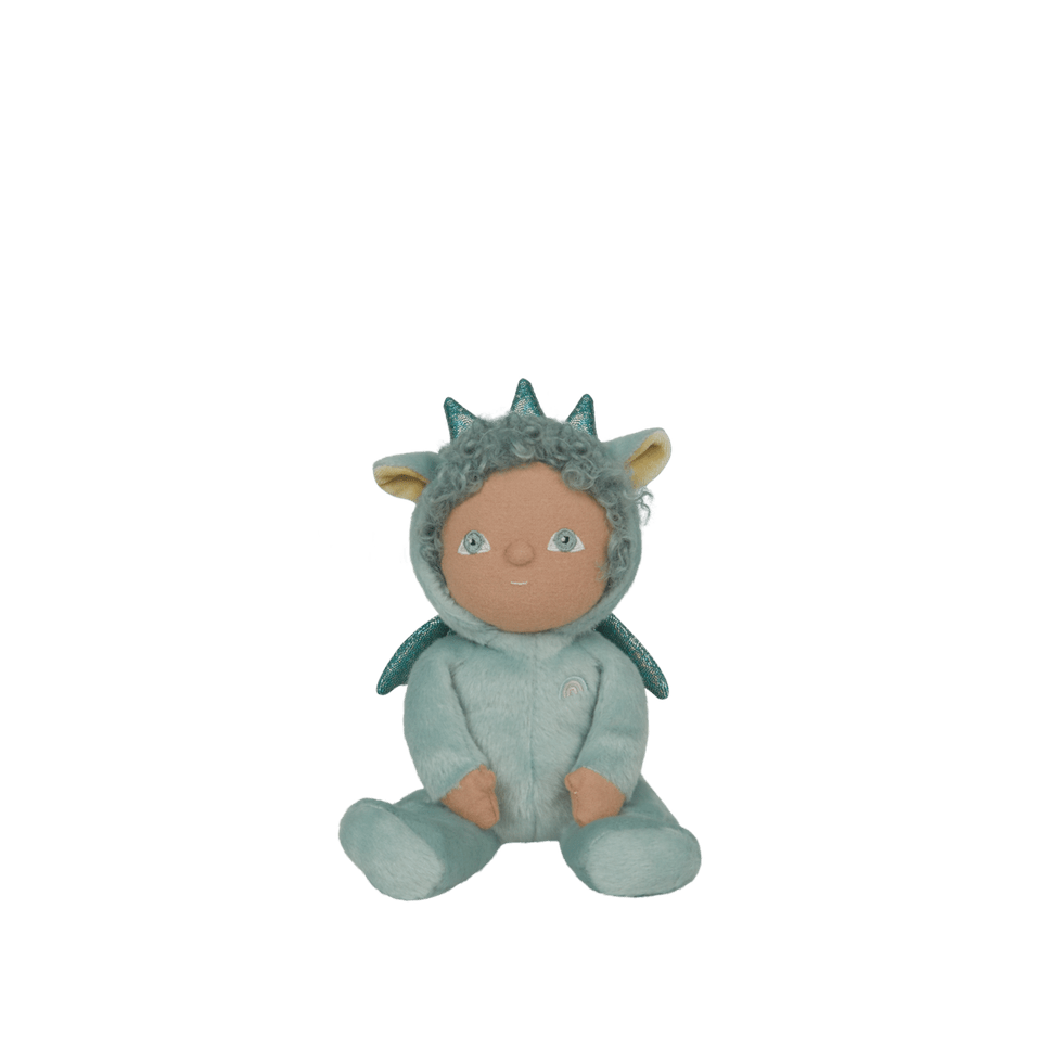 Dante er kledd i en myk drage-onesie med skimrende vinger og små horn. Hetten kan tas av, og under skjuler det seg en søt lugg med myke krøller. Den posérbare kroppen er lett vektet og myk, perfekt både til lek og kos.