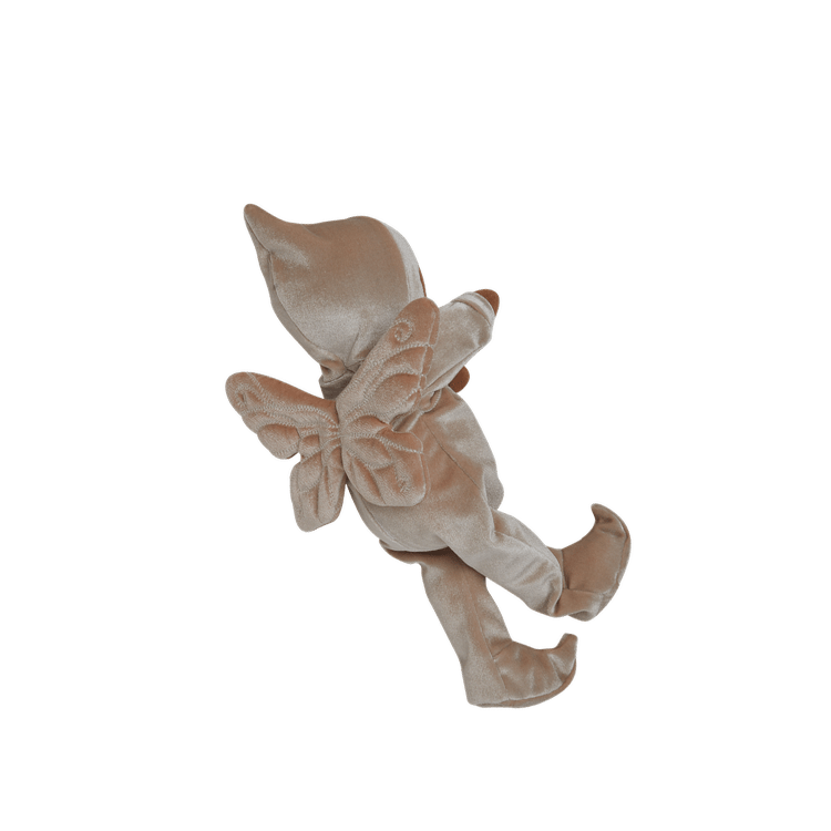 Ada er kledd i en myk, fastsydd velurdrakt med skimrende fevinger og et lite regnbuebroderi på brystet. Ansiktet har delikate broderte trekk og en liten hårtust som gir henne ekstra personlighet. Kroppen er floppy, mykt vektet og lett å posere i ulike sovestillinger, slik at små hender enkelt kan holde henne tett – enten under lesestund, på reise eller ved leggetid.