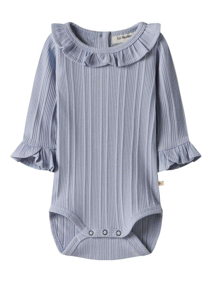 En supermyk og stretchy ribbebody med nydelige volangdetaljer på krage og ermer. Perfekt til både hverdagsbruk og pynt, og matcher leggingsene i samme serie for et helhetlig uttrykk. Bodyen har smal passform, god elastisitet og trykknapper nederst for enkel av- og påkledning.