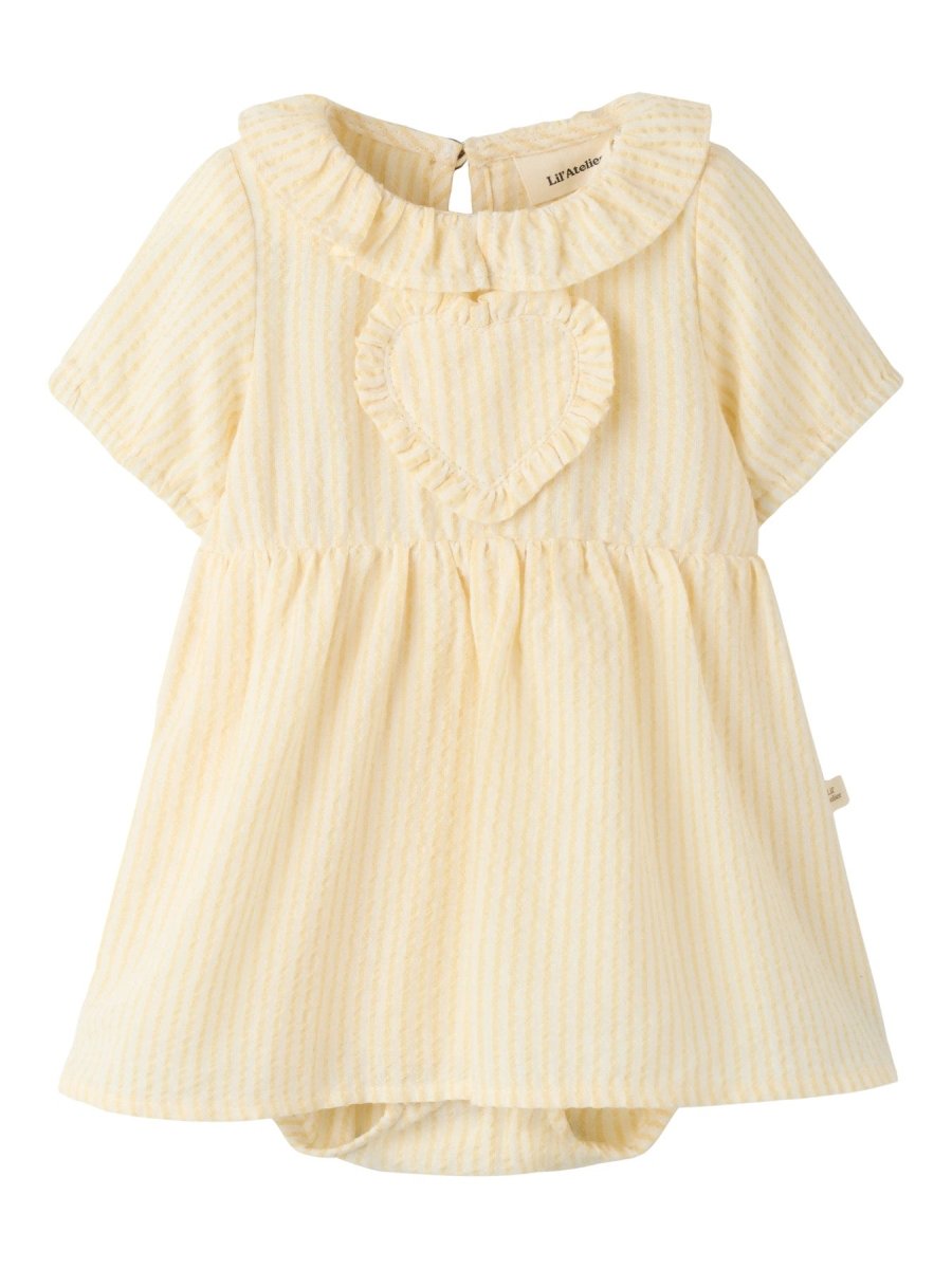 Kjolen kommer i en lys Coconut Milk-base med delikate Sahara Sun-striper, og har en sjarmerende hjertedetalj på brystet med små volanger rundt. Den fine kragen og de korte ermene gir et klassisk og romantisk uttrykk som passer perfekt til både hverdag, besøk og små sommeranledninger.