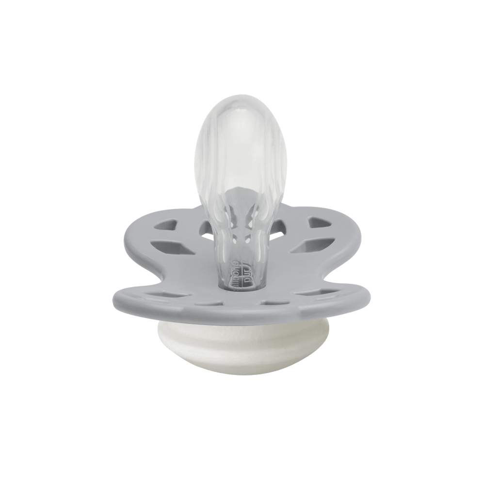 Nippelen er symmetrisk formet for å redusere trykk mot tenner og kjeve. Denne kommer i silikon. Siden nippelen er flat og dråpeformet, støtter den korrekt kjeveutvikling. Silikonnippelen har et innovativt mønster integrert i brystvorten som gjør den mer motstandsdyktig mot babyens første skarpe tenner enn vanlige silikonsmokker er.