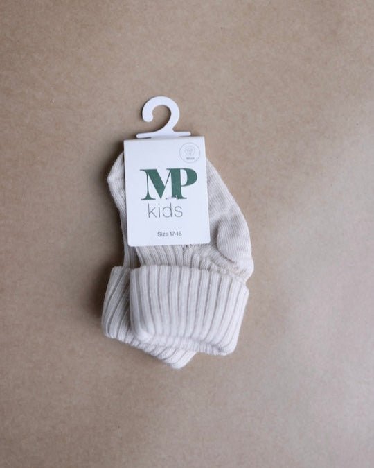 Dette er ullsokkene som faktisk blir sittende på små føtter. Den ribbestrikkede superwash-ullen gir både varme og fleksibilitet, samtidig som den gir en stabil passform som ikke sklir av — selv når tempoet er høyt. Ecru-fargen er myk, nøytral og enkelt å matche med alt fra ullsparkedrakter til hverdagsantrekk.